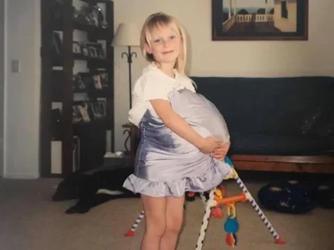 From the start, I was meant to be a doula. My love for babies has been ever-present — here I am at age 5, proudly declaring that I had "13 babies in my belly."